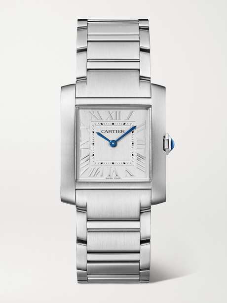 Cartier's 'Française' watch was only added to the iconic 'Tank' collection in 1996 but has since become one of the house's most sought-after pieces. It's been expertly crafted in Switzerland from stainless steel to frame the iconic silvered dial, made instantly recognizable as Cartier's by the Roman numerals and chapter ring. The matching bracelet strap has links modeled after caterpillar tracks of WWII tanks.