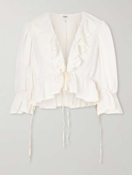 Chloé’s blouse captures the label’s ethereal sensibility. Crafted from airy silk-georgette, it has billowy sleeves and a plunging V-neckline traced with flouncy ruffles and lace trims, while a dainty drawstring cinches the waist with a bow.