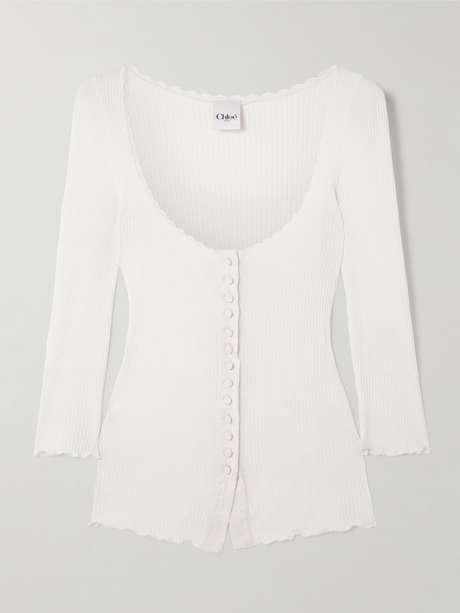 Chloé's Winter '25 collection is filled with intricate details that capture the brand's feminine lightness. This top is made from ribbed cotton with baby lock seams and lace picot trims tracing the scooped neckline. Wear yours layered over a floaty dress or skirt.