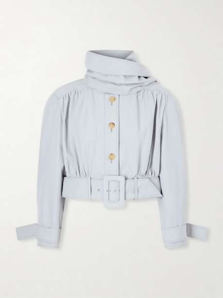 Chloé’s jacket is tailored from a durable linen and cotton-blend canvas and features a cropped fit with gathered detailing on the padded shoulders and waistline. It’s finished with a matching belt and a scarf-inspired neck for a polished, distinctive look.