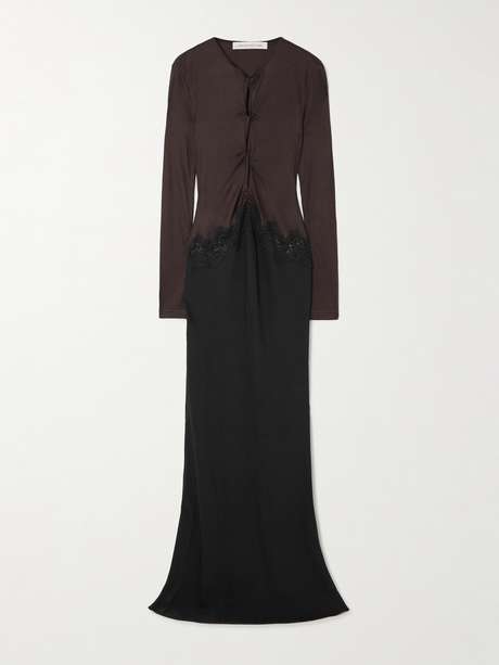 Christopher Esber's tailoring background ensures every piece is designed to flatter the female form. This gown has a fitted, ribbed-knit bodice with subtle twist-front detailing that creates cutouts when stretched over your frame. It's spliced with black V-shaped lace trims along the waist before falling to a languid crepe skirt. The floor-pooling hem trails behind elegantly as you walk.