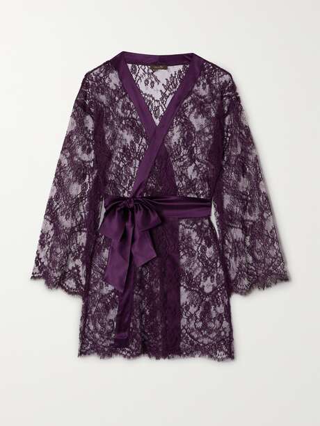 EXCLUSIVE AT NET-A-PORTER. Coco de Mer's 'Lunaria' robe is made from Leavers lace that's blended with touches of silk and cotton. It has glossy satin trims and a detachable belt so you can cinch the waist.