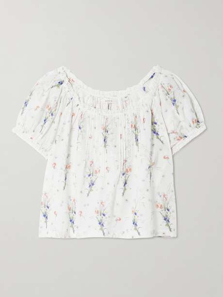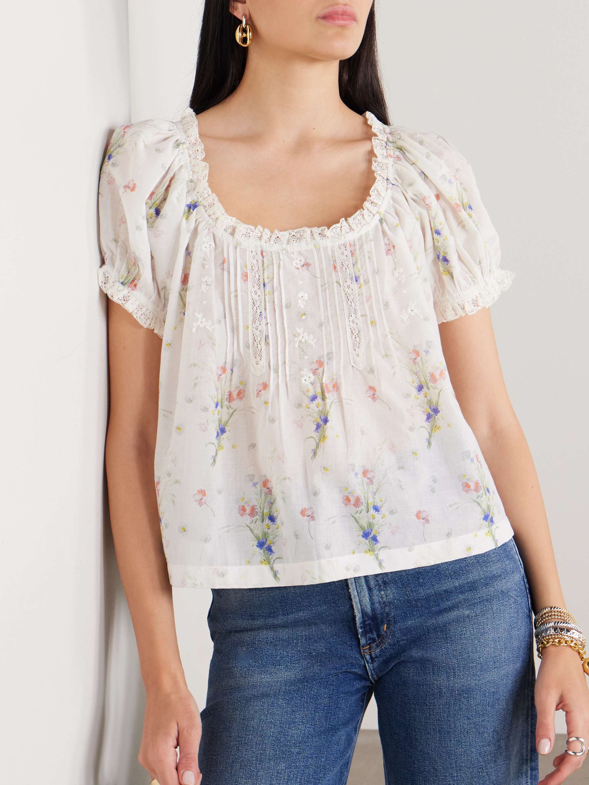 DÔEN Frederica lace-trimmed floral-print pintucked organic cotton-voile blouse