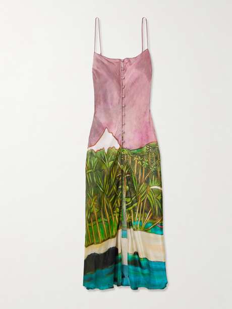 The vibrant print on Donde Esteban's 'La Sierra' dress pays homage to the natural beauty of Colombia. Made from fluid silk-satin, it has a draped neckline framed by pin-thin straps and fastens with covered buttons. Complement the leg-baring split with heels.
