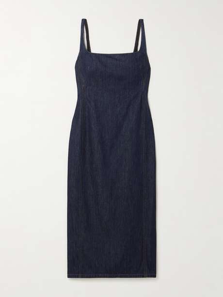 There's an unexpected beauty to Dries Van Noten's denim dress. It's cut in a fitted shape with a gently tapered waist and slender shoulder straps. The square neckline makes a great frame for a stack of delicate chains.