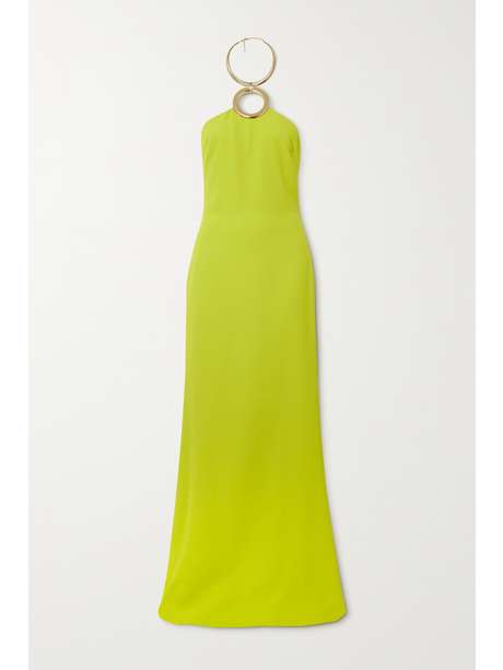 Elie Saab's gown is cut from fluid 'Lime Punch' crepe that feels totally fresh and unexpected. It has a chunky golden necklace that forms the halterneck and turns to an open back and head-turning train so there is something to admire from every angle. Go bold with your rings and bracelets.