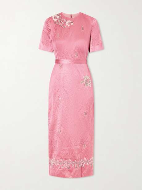 Erdem’s midi dress is crafted from crinkled satin and embellished with a floral motif of sparkling crystals in varied shapes. It has a fitted, darted bodice and a skirt that follows the body’s natural curves, with a matching belt to define the waist.