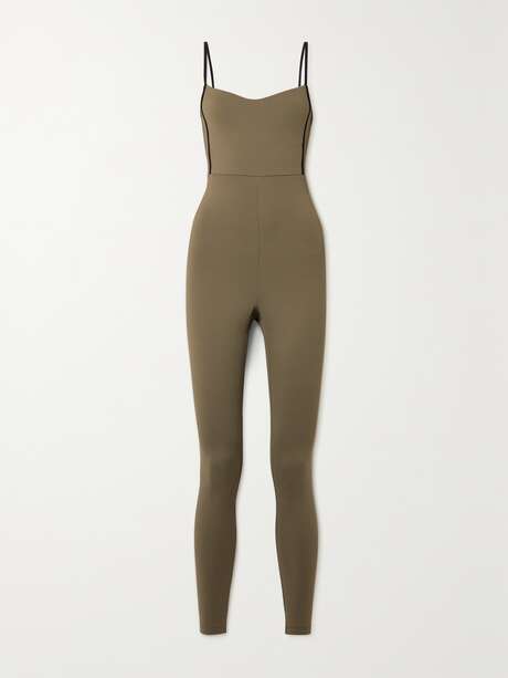 Channel your inner ballerina in your next barre class with this chic yet performance-optimized bodysuit. Made with movement in mind, it's cut from stretchy olive-green fabric with black trims and won't ride up or wriggle down no matter how demanding your session gets. Slip a wrap cardigan on top before and after.