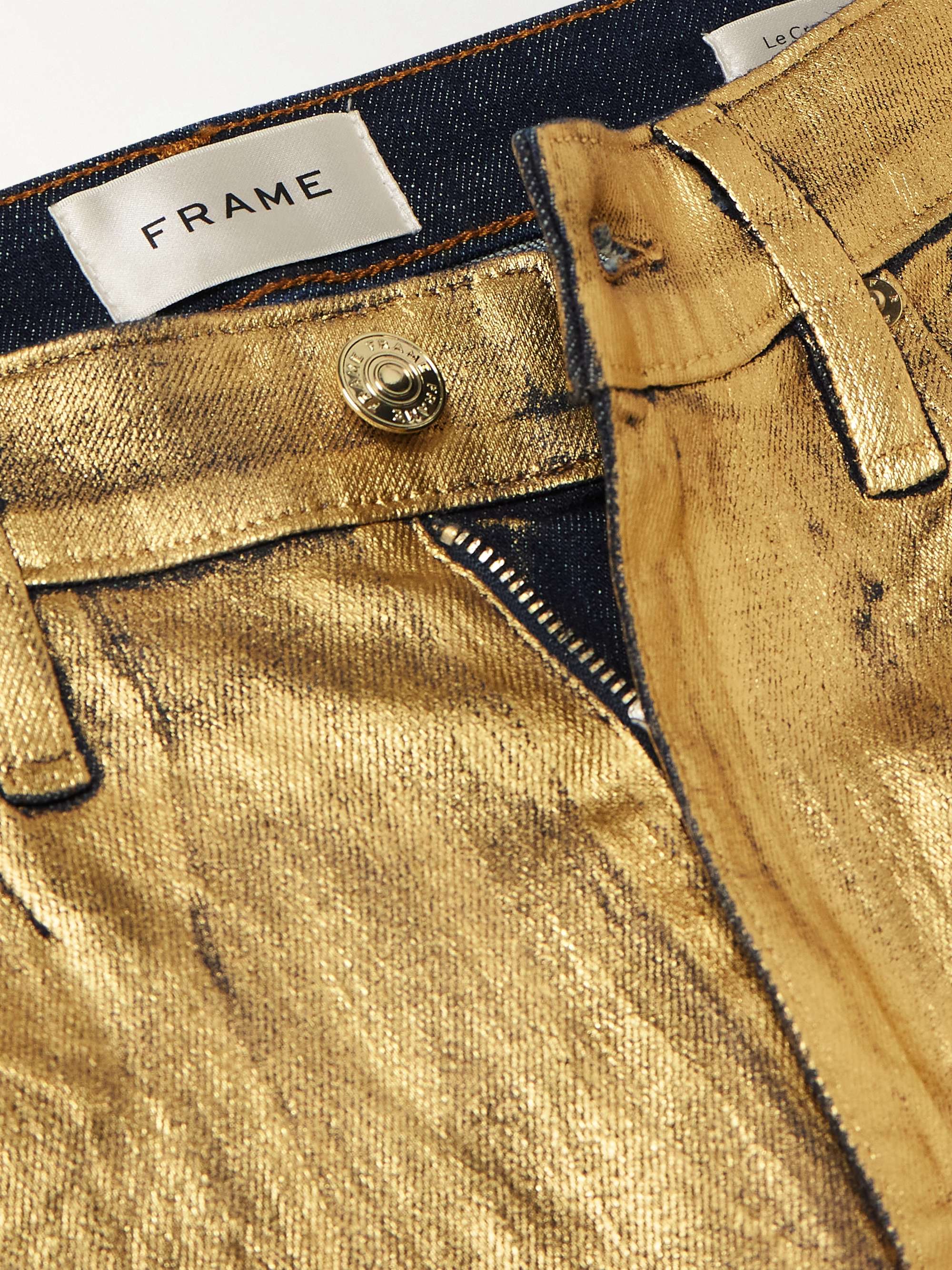FRAME’s jeans are coated to give them a glistening gold finish that easily transitions from day to night – simply swap sneakers for your favorite heels. Cut from denim for a high-rise fit, they’re made with plenty of stretch so they hug your hips and thighs before flaring out to cropped bootcut hems.