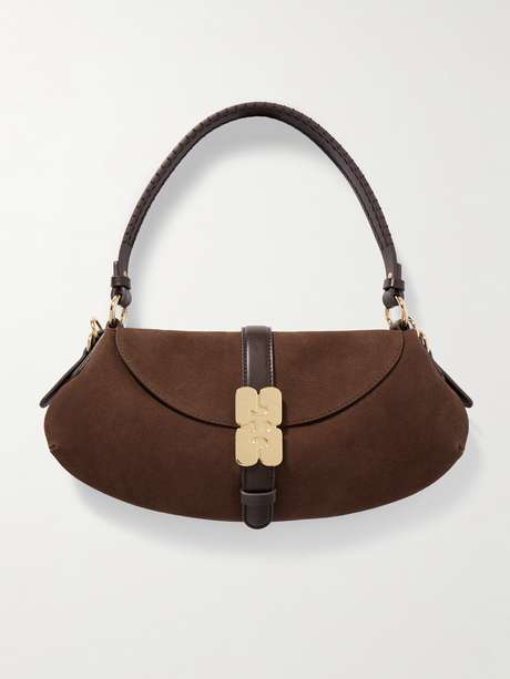 GANNI's 'Kat' shoulder bag takes cues from '00s styles. Made from recycled suede-blend, it has a softly structured shape with a curved flap and the brand's signature metallic hardware at the front. Inside, there's space for your phone, cardholder and keys.
