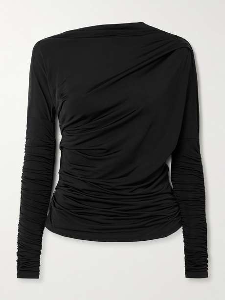 GANNI's top is gently draped at the shoulder for an artful asymmetric look. It's made from slinky satin-jersey and is ruched through the body for a close fit. Style yours with denim in the day and midi skirts at night.