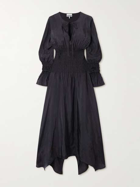 More than your average LBD, GANNI's dress is cut from habotai and has a swishy asymmetric skirt. It's smocked to accentuate your curves and create fluted sleeves and has a tie-detailed neckline.