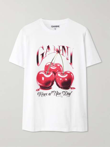 GANNI's T-shirt is printed with a trio of juicy cherries and an uplifting message. It's cut for a slightly loose fit from organic cotton-jersey. Wear yours with denim.