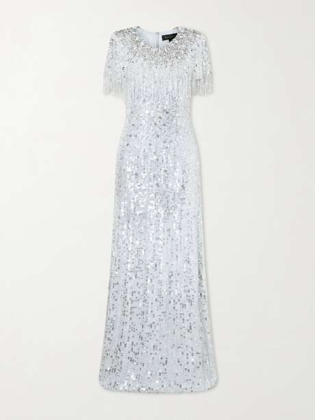 EXCLUSIVE AT NET-A-PORTER. Jenny Packham defines eveningwear through intricate embellishment and refined glamour. The 'Eugene' gown is cut from sequined chiffon in a floor-length silhouette with a crystal-embellished cape overlay; its shimmering surface and fluid drape suit formal occasions.