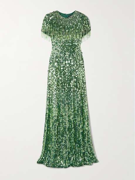 Jenny Packham's 'Eugenie' gown drips with scores of crystals, beads and sequins that reflect every angle of light. Made from satin, it has cape-effect sleeves balanced by strong, padded shoulders. Complement the 'Fern' shade with gold accessories.