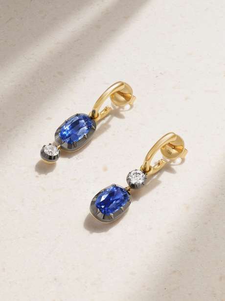 Jessica McCormack's mission is to "breathe new life into heirloom designs, making them relevant and wearable today." Handmade from yellow and blackened white gold, these asymmetric earrings feature deep blue sapphires and sparkling diamonds. The pronged cut down setting is inspired by Georgian-era jewelry.