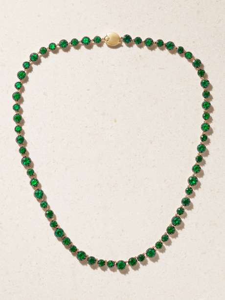 Jessica McCormack's necklace features vibrant emeralds of various sizes, connected by 18-karat yellow gold chain links. The 18-karat blackened white gold settings enhance the brilliance of each jewel.