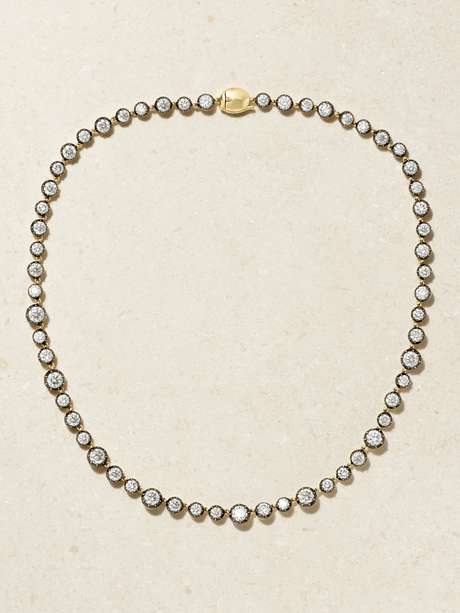 Jessica McCormack's 'Cut-Down Button Back' necklace is illuminated by 17.50-carats of brilliant-cut diamonds - the cut-down setting is a traditional technique from the Georgian period. It's cast from 18-karat yellow and blackened gold and finished with an ornate clasp. Frame yours with scooped or sweetheart necklines.
