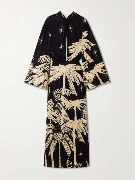 Printed with palm trees and stars, Johanna Ortiz' 'Primera Vez' dress resembles a jungle landscape under the night sky. It's been handmade locally in Colombia from pure silk-georgette and is gently wrapped and draped for a high neckline with a skin-baring cutout. Add chunky bracelets to complement the flowing flared sleeves.