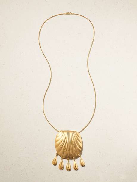 JUJU VERA founder Julia Ferentinos got her start as an antique jewelry dealer, so she knows a thing or two about crafting pieces that look authentically vintage. This 'Petra' necklace is handmade from gold-plated metal that's intricately carved to depict a shell. It's anchored by five pear-shaped drops that sway gently as you move.