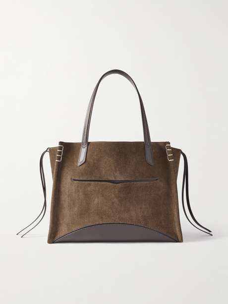 JW Anderson's 'Loafer Cabas' bag is detailed with a sizable penny slot, which doubles as a handy slip pocket. It's crafted from suede and has a leather base, shoulder straps and tassels on each side. The spacious interior fits a few books and a water bottle.
