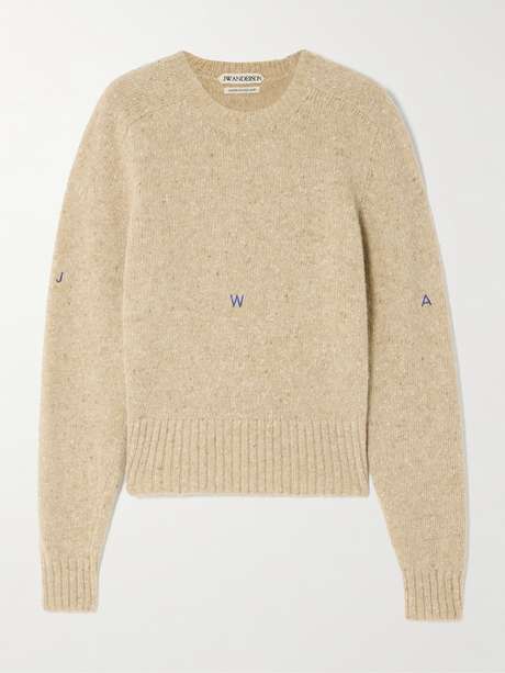 JW Anderson's sweater is embroidered with the brand's initials in bold blue threads across the chest and sleeves. It's knitted from merino wool and mohair-blend in a versatile beige mélange and has ribbed trims.