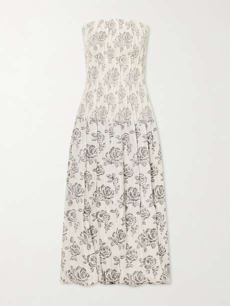 KALLMEYER’s 'Blanche' gown is crafted from lustrous brocade with a silver floral motif. It features a straight strapless neckline and a shirred, fitted bodice that opens into an A-line, ankle-length skirt.