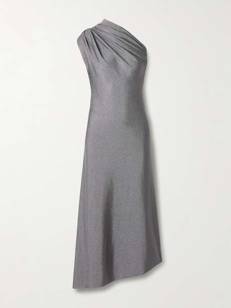 KHAITE's 'Coast' dress has a draped, one-shoulder neckline and asymmetric hem. Knitted from shimmery Lurex, it fits slim through the waist and falls to a flowy skirt.