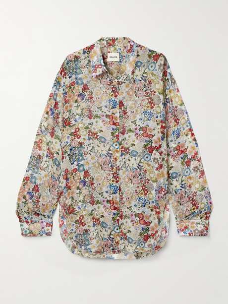 KHAITE's 'Goya' shirt is printed with colorful flowers - the same can be seen on the coordinating 'Tilly' shorts and 'Taja' dress. It's made from lightweight silk-chiffon and has a loose fit and split curved hem. Temper the sheer finish with a tonal tank.