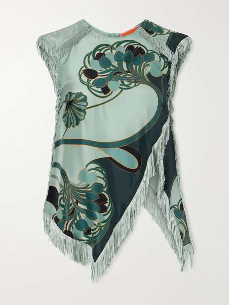 La DoubleJ’s blouse is cut from printed silk-satin in a scarf-inspired silhouette that drapes fluidly across the frame. It’s traced with swaying fringed trims that enhance the movement.