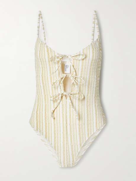 Lisa Marie Fernandez’s swimsuit is defined by a trio of ties through the front - adjust them to cinch the shape and coverage. It's made from striped seersucker and has slim shoulder straps. Style it off the beach with high-rise jeans.