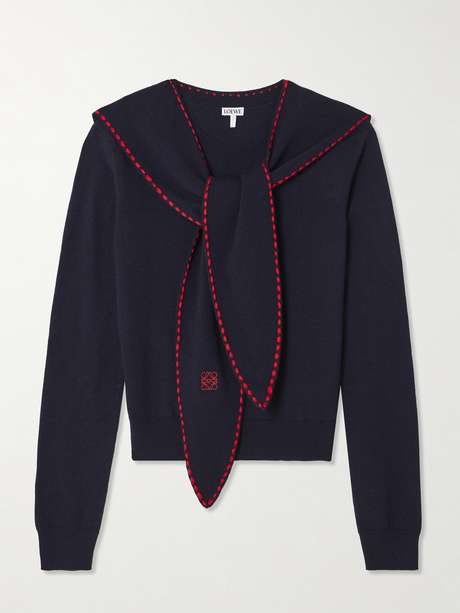 Loewe approaches everyday dressing with a subtle inventive twist. This fine-knit sweater features a preppy scarf panel that drapes fluidly from the neckline and is outlined with contrast stitching for definition. Style yours simply with tailored pants or a fluid skirt.