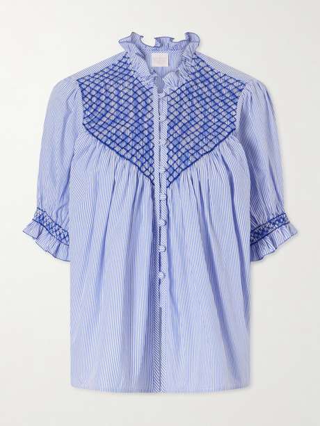 LORETTA CAPONI Milvia shirred striped cotton-poplin blouse