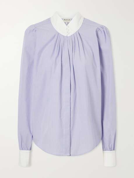 Soft structure defines Maison Mayle's 'Val D'Isere' blouse, cut from fine striped cotton. It falls into gentle gathers from a rounded contrast collar, finished with delicate covered buttons and crisp cuffs, balancing romantic detail with quiet everyday refinement.