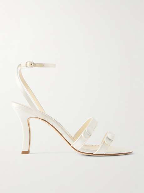 Manolo Blahnik's 'Neusita' sandals have been made in Italy from lustrous cream satin and are topped with covered buttons on the straps. They have low vamps and are set on 90mm curved stiletto heels.