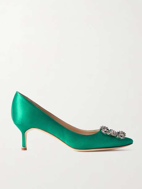 Manolo Blahnik's satin 'Hangisi' pumps have been made at one of the designer's beloved factories in Italy, where he's often found developing samples and whittling lasts by hand. Lined and soled in leather, they're topped with the signature glistening buckle that first appeared in Spring '08 and has remained enduringly chic ever since.