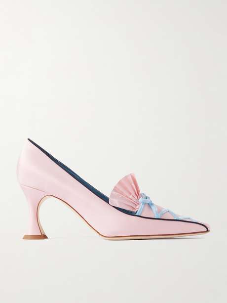 Manolo Blahnik's 'Rohan' pumps belong to the label's exclusive capsule celebrating Marie Antoinette – this pair pays tribute to her rose garden and "creative use of makeup". Made in Italy from silk with grosgrain edges, they have pointed toes detailed with corset-inspired velvet lattices and ruffles.