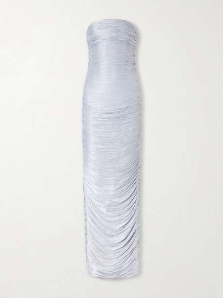 Marmar Halim is known for its sculptural approach to eveningwear. This strapless gown is cut from lustrous satin, artfully gathered through the bodice before falling to a sweeping hem.