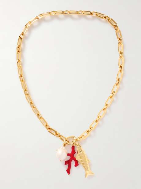 Inspired by underwater landscapes, Martha Calvo's 'Barrier' necklace is strung with a trio of pendants, including a red enamel coral, a gold-plated fish and a lustrous pearl. It's made from gold-plated metal and defined by sleek elongated links. Add or remove the charms, to make it your own.