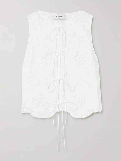 Matteau's top makes the perfect summery set with the matching skirt in our edit. Cut from broderie anglaise cotton, it has a scalloped hem and open front that fastens with slim ties. Underpin yours with a bralette to temper the sheerness.