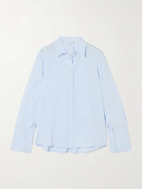 The soft light-blue shade of Max Mara's 'Voliera' shirt will always feel elegant. Made from silk-blend crepe, it has a pleated back yoke to enhance the loose shape and flares slightly at the cuffs. Wear yours with jeans or tailored pants.
