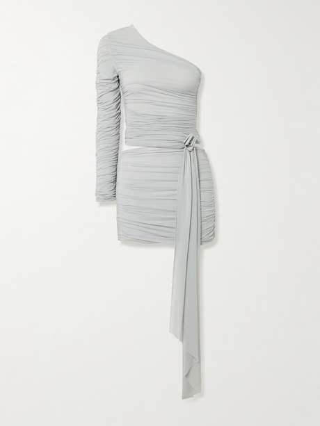 Maygel Coronel's 'Socarras' set features a top and mini skirt, which can be worn together or separately, depending on your mood. Made from ruched stretch-mesh, the top has a one-shoulder neckline and is appliquéd with the brand's signature 3D flower.