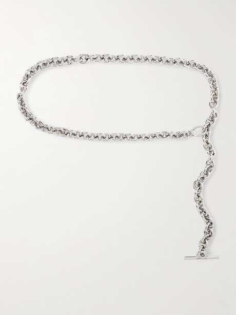 McQueen's chain belt is tipped with an industrial 'T-bar' detail that you'll recognize from the label's bags and blazers. It's made from silver-tone metal that's polished for a high shine.