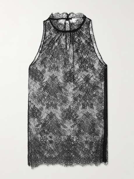 Infused with gothic Victorian flourishes, McQueen’s Fall ’25 collection channels the dandy’s radical spirit, reinterpreted for the modern age. This delicate lace top was featured on the runway and has a high, gathered neckline and scalloped edges traced with eyelash trims. Underpin yours with a bralette.