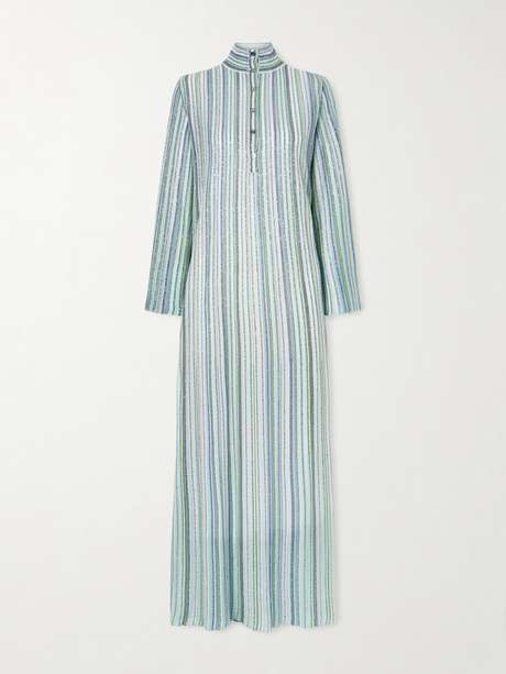 MISSONI Sequin-embellished striped metallic crochet-knit turtleneck maxi dress