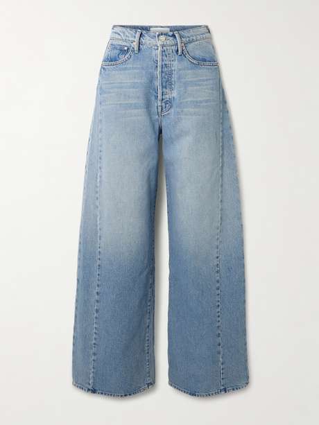 MOTHER's jeans are made from classic blue-wash denim with visible stitching on the outer seam, creating a cool, paneled finish. They have a high-rise, wide-leg shape and fall to clean hems.