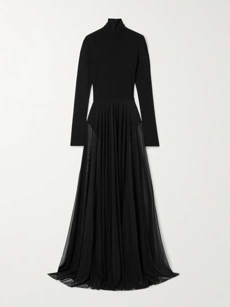 Norma Kamali’s gown fuses the look of a bodysuit and skirt into one chic design. The stretch-jersey bodice fits close to the frame, while the sheer mesh skirt adds weightless volume and fluid movement with each step.