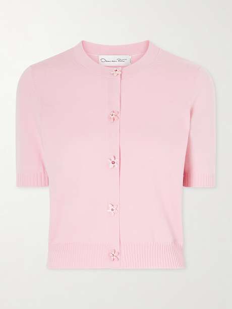 Oscar de la Renta’s love for flowers is evident in this cardigan, knitted from soft wool. It has a close fit with short sleeves and ribbed hems, and features flower-shaped buttons that add a romantic, delicate touch.