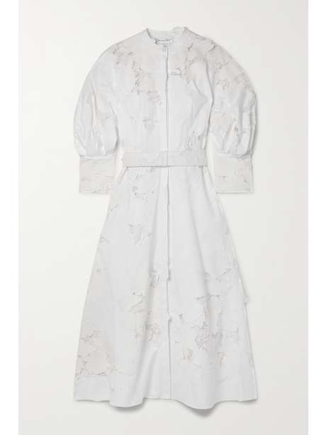Oscar de la Renta's midi dress has been made in Italy from white cotton-blend poplin spliced with guipure lace panels. It has romantic puffed sleeves and a coordinating belt to cinch the waist. Style yours with pumps and a colorful bag.