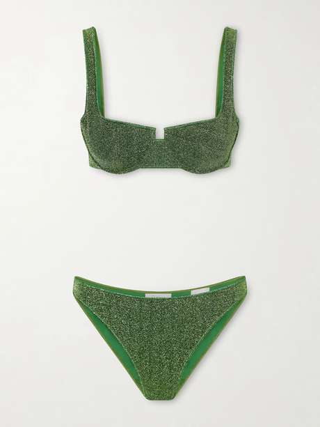 Oséree's 'Lumière' bikini is made from green metallic fabric that shimmers as it catches the light. It has a balconette top with supportive wired cups and low-rise briefs. Wear yours with one of the label's coverups.